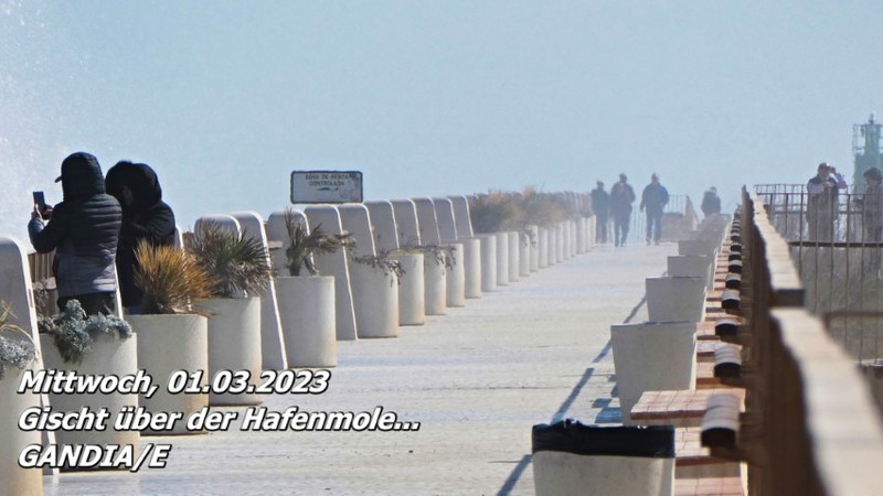 Grund genug, einen Spaziergang in Richtung Uferpromenade und Hafenmole zu unternehmen, um dieses Schauspiel noch einmal zu erleben. Es handelt sich nur um eine sogenannte Windsee, die gerade durch starken Ostwind hervorgerufen wird. Der Wind drückt das Wasser des Mittelmeeres vor sich her in Richtung Ufer. Kurz vor dem Ufer brechen sich die Wellen und schwappen auf den Strand.