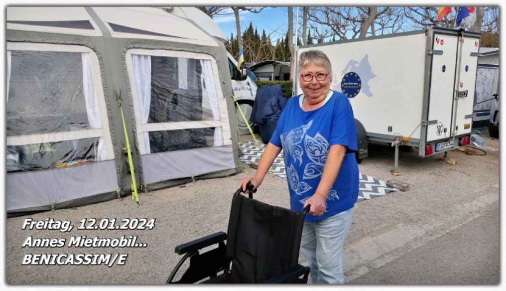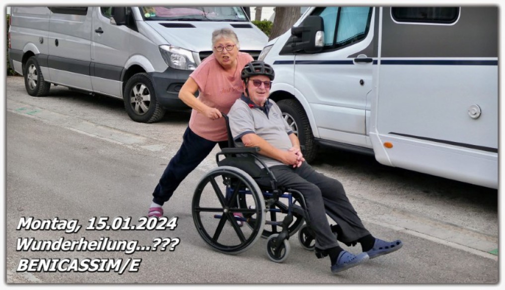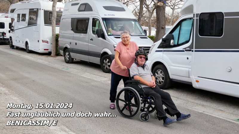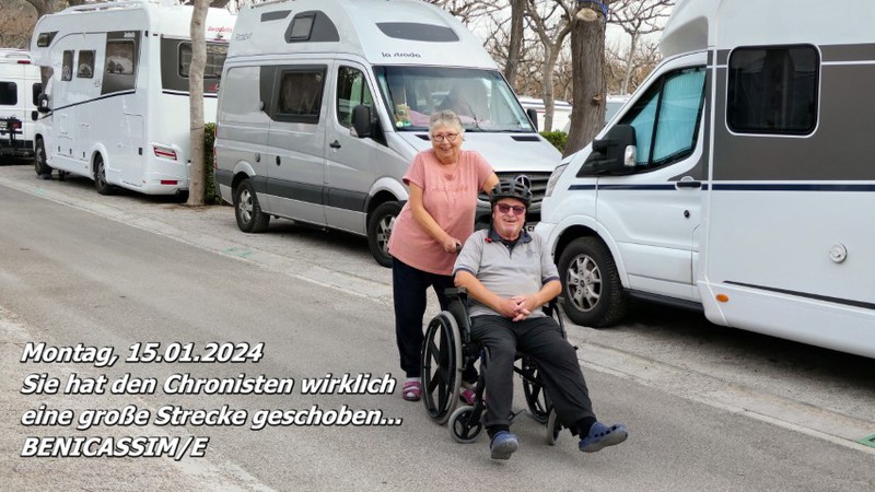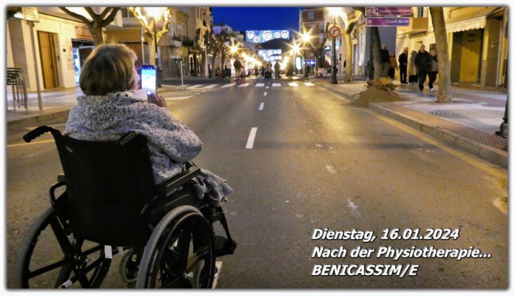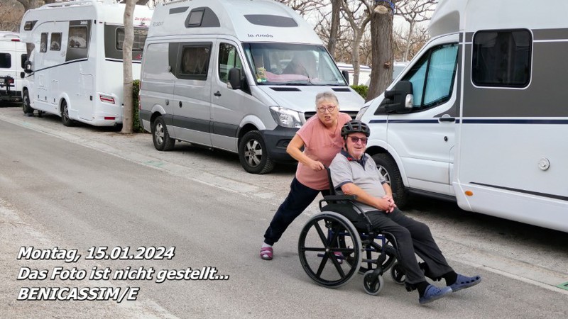 In BENICASSIM/E angekommen, setzte sie das Lauftraining mäßig fort. Es hat ihr gut getan. Zurzeit benutzt sie den Rollstuhl als Laufhilfe, mit und ohne den Chronisten darin.