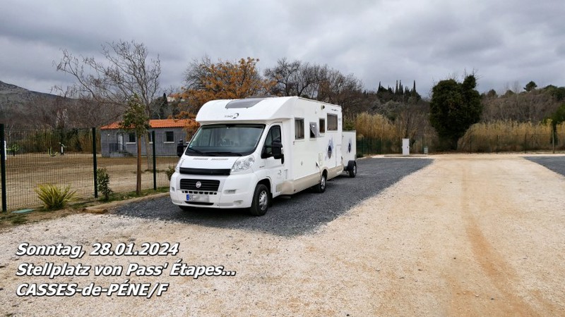 Gegen 13:30 Uhr erreichen wir den neuen Stellplatz von CASSES-du-PÈNE/F in der Nähe von PERPIGNON/F. Es ist ein Platz der Organisation „Pass‘ Étapes“. Er ist leicht und bequem zu erreichen, und wir können mit angekuppeltem Anhänger parken.