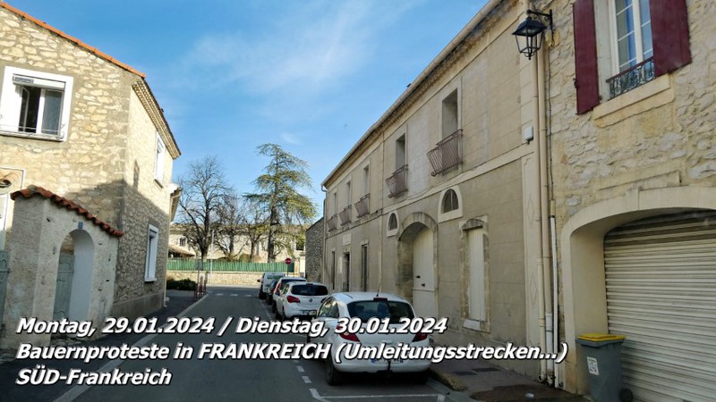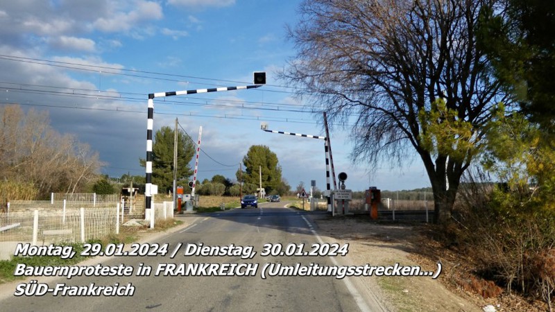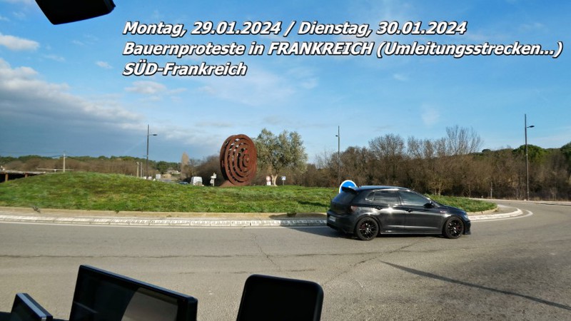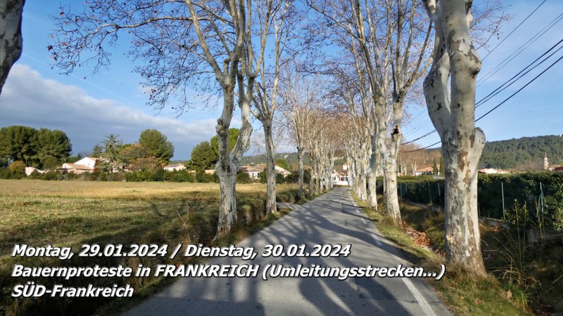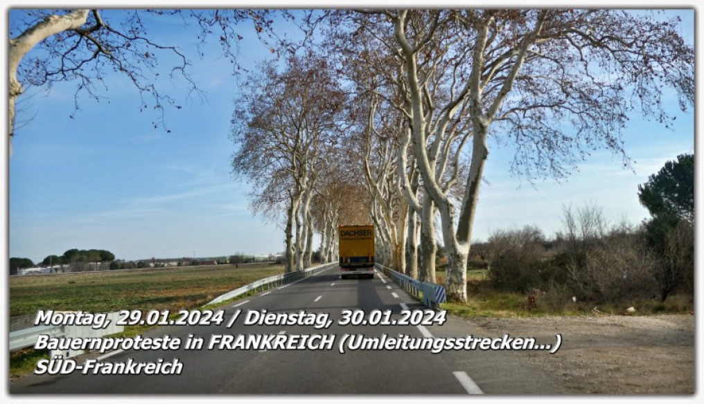 Am 29.01.2024 fuhren wir von CASSES-de-PÈNE/F nach VILLEFRANCHE-sur-SAONE/F. Kurz nach der Auffahrt auf die Autobahn wurden alle Verkehrsteilnehmer von der Gendarmerie auf völlig überfüllte Nebenstraßen umgeleitet. Die Autobahn in Richtung LYON/F war komplett gesperrt, teilweise mit Mist und brennenden Reifen unpassierbar gemacht. Die französischen Bauern leisteten ganze Arbeit und der französische Staat erschien machtlos.