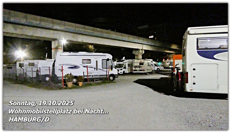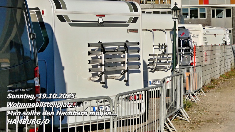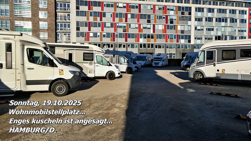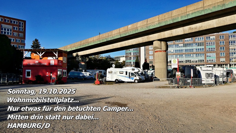 Der Wohnmobilstellplatz in Hamburg/D liegt tatsächlich mitten in der Stadt. Alles Wichtige ist bequem zu Fuß erreichbar. Dafür ist der Platz eng, laut und teuer. Aber was soll man sich beschweren – wer in eine Millionenstadt fährt, darf keine Ruhe und Entspannung erwarten.