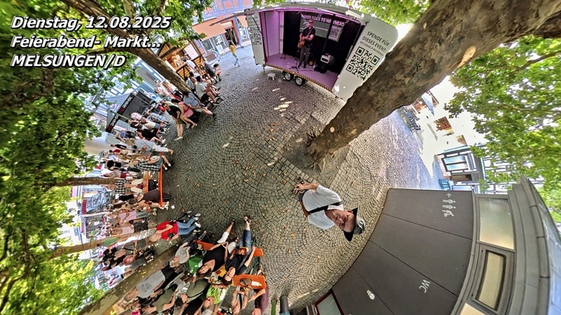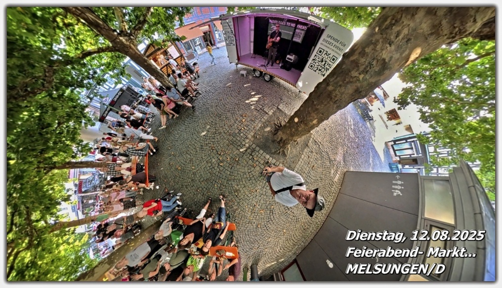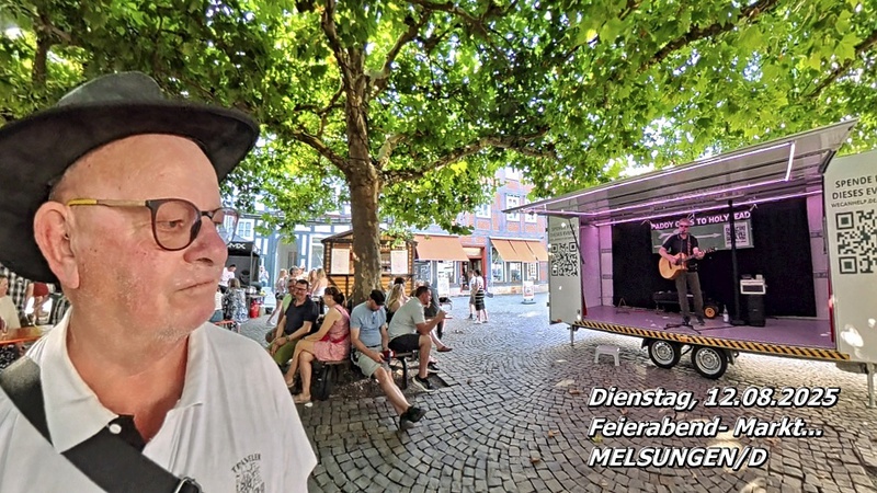 Gestern in den frühen Abendstunden waren wir noch in Melsungen/D auf einem Feierabendmarkt. Es gab einiges zu kaufen, doch noch mehr zu essen: von Bratwurstspezialitäten über die berühmte Aale Wurscht bis hin zu Pizza und Döner war alles vertreten. Dazu gab es Bier und Wein – natürlich nur wegen der herrschenden 34 °C … und ein bisschen wegen der Gemütlichkeit. Auf der Bühne spielte Live-Musik – ein gelungener Mix aus Bürgertreffpunkt und Feierabendstimmung.